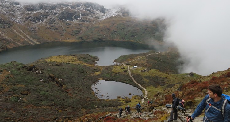 Aujourd'hui est vraiment spectaculaire, traversant quatre hauts cols avec des traversées aérées et des sections de crête spectaculaires offrant une vue imprenable presque constante sur les sommets enneigés. Préparez-vous à la neige si vous partez en randonnée en avril. Il y a un magasin de thé solitaire sur le Shipton La, mais il est probable que vous ne déjeunerez pas avant d'atteindre Dobate, alors assurez-vous d'emporter beaucoup de collations et d'eau avec vous car la journée est longue et difficile (on vous donnera peut-être un pique-nique aujourd'hui). Il faut environ une heure d'ascension à travers les buissons de rhododendrons jusqu'à ce que vous atteigniez votre premier col de la journée - le Khongma La à 3 890 m. De là, si c'est clair, vous verrez Makalu et Chamlang. Vous descendez un court instant avant de remonter vers votre deuxième col. Il y a des vues de Kangchenjunga à avoir en traversant une crête aérée. Quelques marches de pierre escarpées vous amènent à Sano Pokhari Danda à 4 105 m avec le lac Sano Pokhari en contrebas. Pour y arriver depuis le Khongma La, il faut environ une heure, bien que ce soit plus long si vous négociez votre chemin dans la neige. D'autres ondulations vous amènent au col le plus élevé - le Shipton La à 4 200 m. Il y a un abri en étain / magasin de thé ici qui sert les randonneurs et les pèlerins assoiffés et fatigués pendant la saison. Le col est marqué par un mur de mani et un cairn orné de drapeaux de prière près de l'abri. C'est une montée assez raide jusqu'au Shipton La mais pas difficile. Vous descendez sur un terrain moins escarpé jusqu'au lac Kalo Pokhari à 4 080 m. Il est orné de drapeaux de prière et est visité par les pèlerins hindous lors du festival Janai Purnima. Depuis le lac, c'est une montée plus facile vers votre dernier col de la journée - le Keke La à 4 170 m. Enfin, environ 45 minutes supplémentaires de descente vous amènent à votre lodge à Dobate - un spectacle très apprécié après vos quatre labeurs de passage ! Il y a un assez bon lodge propre ici avec un propriétaire sympathique et accueillant. Le dal bhat sera particulièrement bon en guise de récompense pour vos efforts d'aujourd'hui.