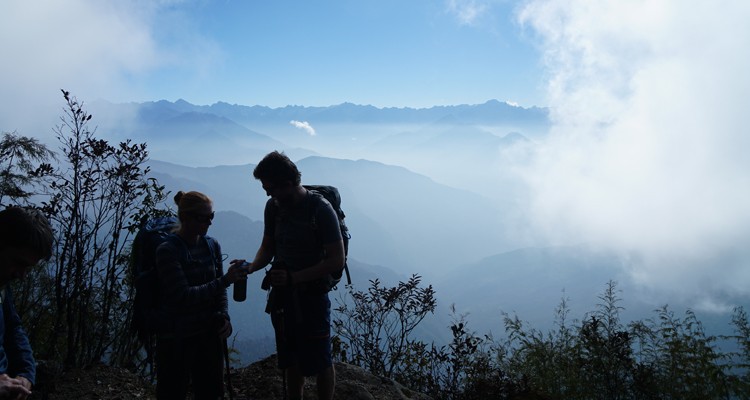 Soyez prêt pour beaucoup d'ascension aujourd'hui! Vous commencez par monter hors de Tashigaon et montez sur des marches en pierre. Au bout d'un moment, vous traversez un pont en rondins et continuez à monter à travers une magnifique forêt de rhododendrons. C'est une montée raide mais une belle promenade avec des gobe-mouches verdâtres, des treepies et des parulines qui gazouillent à travers les arbres, avec des éperviers au-dessus. En avril, les rhododendrons et les magnolias en fleurs offrent un premier plan coloré avec des sommets enneigés à l'est. En regardant en arrière, vous verrez Tashigaon bien en dessous de vous. Après environ trois heures, vous atteignez Dhara à 2 867 m, qui abrite un magasin de thé, et vous y déjeunerez probablement car c'est votre dernière chance de vous rafraîchir jusqu'à Khongma. En quittant Dhara, c'est une montée raide d'environ une heure jusqu'à Unshisa à 3 200 m, où vous passez devant un rocher géant. Il y a une cabane à thé ici (fermée en avril 2019) et des drapeaux de prière marquant ce col. Depuis Unshisa, c'est plus implacable de grimper sur des marches de pierre à travers la forêt de rhododendrons. En avril 2019, il y avait pas mal de neige sur cette section, ce qui rendait les choses un peu plus délicates. Finalement, après quelques heures de travail vers le haut depuis Unshisha, vous atteignez une halte en pierre avec des drapeaux de prière, et encore 15 minutes - ½ heure - vous amènent à Khongma Danda à 3 560 m. Il y a trois lodges à Khongma, et il peut aussi y avoir pas mal de neige ici.