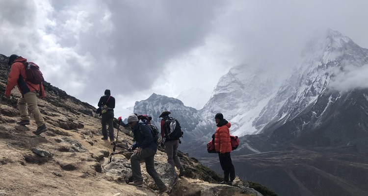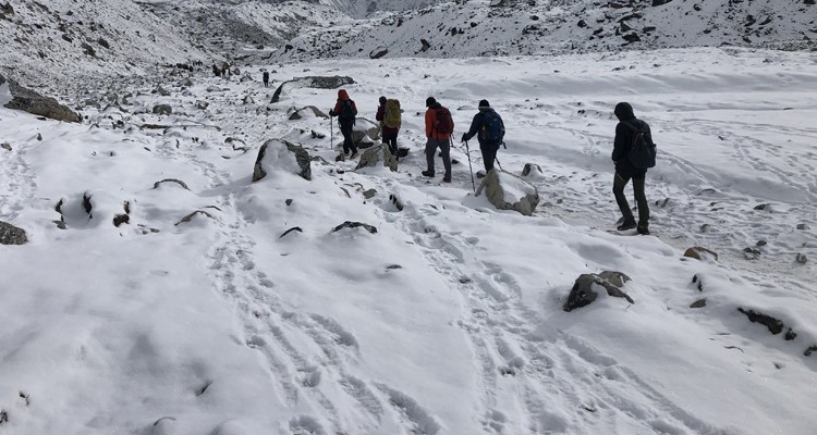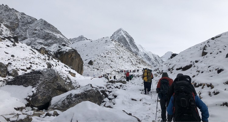 Une fois de plus, après le petit-déjeuner, nous traversons le Khumbu à travers les masses de glace jusqu'au camp de base de Kongma La à (5 000 m / 16 404 pieds). Cette section de notre ascension vers le col de Kongma La est probablement la partie la plus difficile de notre trek. En chemin, de nombreux cairns rocheux drapés de drapeaux de prière marquent le col. Lors de notre descente, nous traversons Imja Khola où l'eau des pentes de l'Everest s'accumule. Après avoir traversé cette vallée, nous descendons vers Chhukung, un village d'été pittoresque. Après avoir atteint Chhukung, votre guide vérifiera ses instruments et notre équipement avant notre ascension finale vers Chhukung. Au lieu de prendre l'itinéraire par le col de Kongma La, nous pouvons emprunter un itinéraire alternatif via Dingboche jusqu'à Chhukung. Repas - petit-déjeuner, déjeuner et dîner.