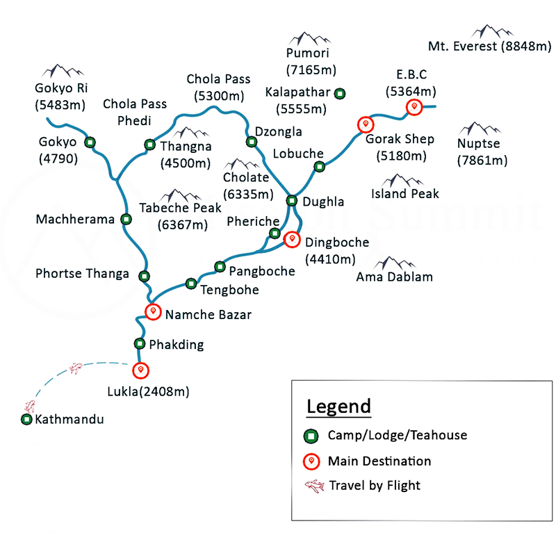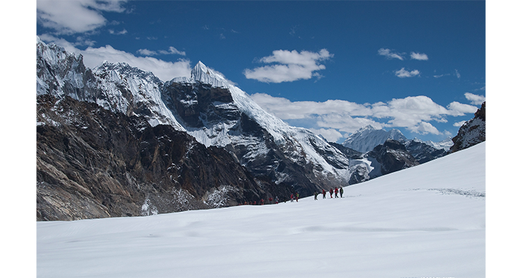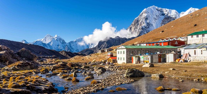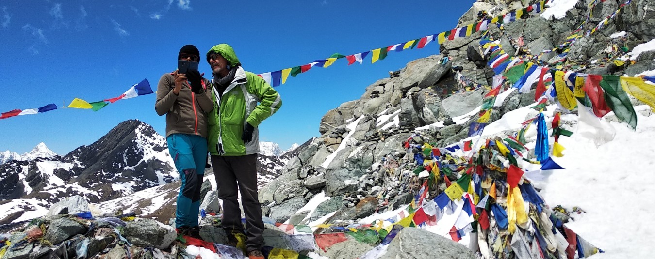 Tôt le matin avant le soleil, nous commençons à marcher pour éviter les intempéries. C'est une montée raide à travers le sentier rocheux difficile. Cho La Pass à 5300 mètres est une autre bonne vue sur l'Everest et d'autres hauts de l'Himalaya. S'il y a de la neige, nous devrons peut-être utiliser les cordes et le matériel d'escalade. Ensuite, nous devons gérer le sentier de descente raide que nous devons gérer très attentivement. Avec un doux duvet
