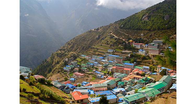 Montée jusqu’à Jorsale, 2800 m le long de la Dudh Kosi. Traversée de la rivière et montée rapide de 600 m jusqu’à Namche Bazaar à 3440 m. Namche Bazaar est un gros bourg Sherpa, avec de nombreuses boutiques, bureau de poste, banque, centre d’information sur le Parc Nuit en lodge. 6 h de marche – Dénivelé : +796 m / -150 m